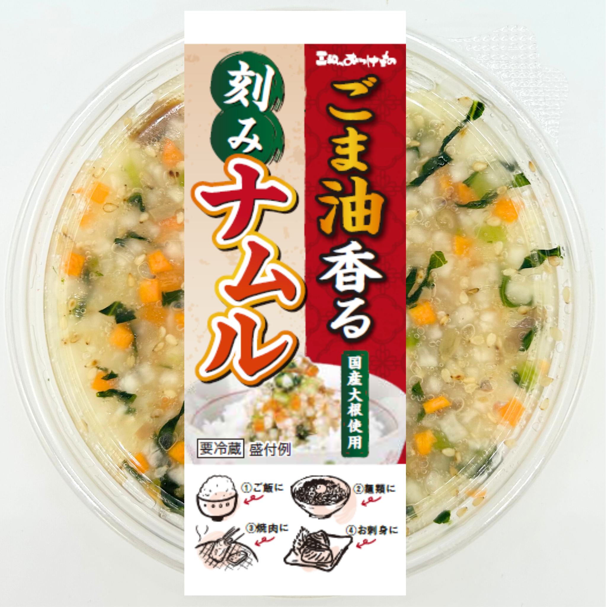大根、人参、小松菜、ぜんまい、漬け原材料[植物たん白加水分解物、糖類(ぶどう糖果糖液糖、砂糖)、ごま油、食塩、ごま、醤油、がらスープ(調味料)、かつおだし、醸造酢]/調味料(アミノ酸等)、酒精、増粘多糖類、pH調整剤、酸味料、酸化防止剤(V.C)、乳酸カルシウム、(一部に小麦・ごま・大豆・鶏肉を含む)